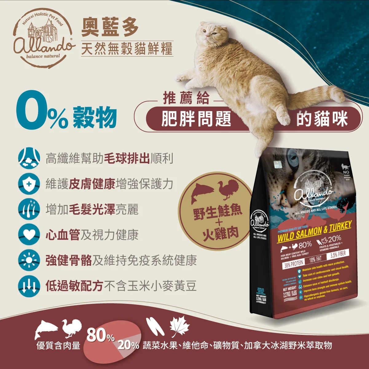 😺優惠裝:1.2KG 包裝 x 2包 😺食用到期日:12/4/2026 推薦給身體機能不佳或肥胖的貓咪 寵物食品資深營養配方師Fabio Soller : 「藉由健康的飲食,讓貓咪如同城堡裡的貓一樣備受呵護。」奧藍多天然無穀貓糧堅持天然的食材就是最美好的食物,研發團隊於1992年開始致力提倡寵物 #天然成分飲食法則 ,嚴選產地天然新鮮食材來調配「營養均衡」且「值得信賴」的食譜,提供貓咪攝取生長必需的營養,堅持遵循自然食譜的健康飲食法為貓咪健康作最嚴格把關。 奧藍多天然無穀貓鮮糧 選用的食材不但低鹽、低油、低鎂且低碳水化合物,並堅持健康飲食,嚴選產地野生、自然放養, 無施打抗生素及荷爾蒙 的新鮮去骨肉類為主食,配合產地檢驗合格無藥物殘留 水果、蔬菜補充營養,不但滿足口慾也提供貓咪完整天然的均衡健康飲食👍👍👍 🐟野生鮭魚擁有高蛋白、低脂肪、含豐富維生素及礦物質,具保護腦部發育、降低膽固醇、預防心血管等疾病等作用,魚肉中的牛磺酸更有維護貓咪視力功效。 🦃自由放養火雞肉含有豐富的鐵、鋅、磷、鉀、硒、維生素B等營養素,可抗氧化功能及增進自身免疫力。 ✅完美營養比例 ✅混合多種新鮮天然食材 ✅低鹽低油低鎂低碳水化合物 ✅低敏配方 ✅SGS / TUV / HACCP品質安全認證 ✅特殊微潤圓薄顆粒提高適口性 ❎不含玉米、小麥、黃豆等過敏源成分 ❎不含動物副食品 ❎不含生長賀爾蒙 ❎不含抗生素 ❎不含化學保存劑 有助貓咪健康 : 🧶高纖維幫助毛球排出順利 😸維護皮膚健康增強保護力 ✨增加毛髮光澤亮麗 💓👀心血管及視力保健 🦴強健骨骼及維持免疫系統健康 ❎低過敏無穀配方不含玉米小麥黃豆 成分 🥩80% 優質含肉量 🥬20% 蔬菜水果、維他命、礦物質、加拿大冰湖野米萃取物 🈚0% 穀物 包括: 去骨野生鮭魚、去骨火雞肉、去骨鯡魚、去骨鰹魚、鮭魚油、脫水雞肉、雞肉脂肪(與維生素E混合)、加拿大冰湖野米萃取物、整粒低溫烘焙亞麻籽、鷹嘴豆、紅蘿蔔、甜菜、蔓越莓、綠菠菜、蘋果、南瓜、西蘭花、豌豆、青扁豆、藍莓、藍藻、多種礦物質(鐵、銅、鋅、錳、硒、碘)、多種維生素(維生素A、維生素B1、維生素B2、維生素B5、維生素B6、維生素B9、維生素B12、維生素D3、維生素E、維生素C、維生素H)、酵母提取物、絲蘭萃取物 更多產品資訊 : https://www.allandopetfood.com/about.html